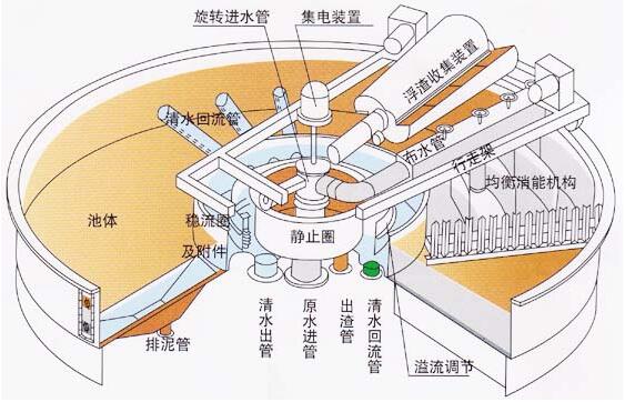 淺層氣浮機(jī)整體呈圓柱形,結(jié)構(gòu)緊湊,池子較淺。淺層氣浮機(jī)結(jié)構(gòu)主體由五大部分組成:池體、撇渣裝置、工作橋和行走裝置、布水布?xì)庋b置、集水裝置、集電裝置等組成。進(jìn)水口,出水口與浮渣排出口全部集中在池體中央?yún)^(qū)域內(nèi),布水機(jī)構(gòu),集水機(jī)構(gòu),溶氣釋放機(jī)構(gòu)都與框架緊密連接在一起,圍繞池體中心轉(zhuǎn)動。淺層氣浮機(jī)提供成套設(shè)備總成及控制系統(tǒng),通過集中控制與分散控制相結(jié)合,以使設(shè)備達(dá)到運(yùn)行狀態(tài)。