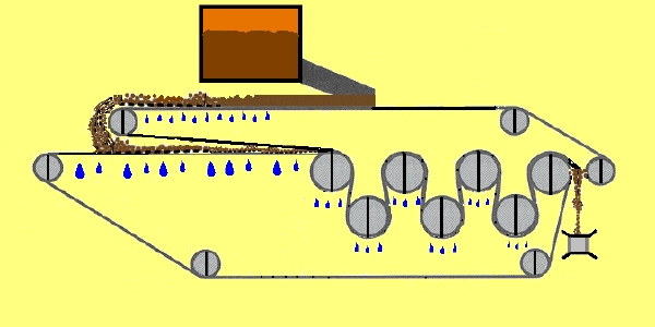 順利進(jìn)入擠壓脫水區(qū),進(jìn)入“ S ”壓榨段,在“ S ”型壓榨段中,污泥被夾在上、下兩層濾布中間,經(jīng)若干個(gè)壓榨輥反復(fù)壓榨,上下兩條濾帶在經(jīng)過(guò)交錯(cuò)各輥形成的波形路徑時(shí), 由于兩條濾帶的上下位置順序交替,對(duì)夾持的泥餅產(chǎn)生剪切力, 將殘存于污泥中的水分絕大部分積壓濾除,促使泥餅再一次脫水,后通過(guò)刮刀將干泥餅刮落,由皮帶輸送機(jī)或無(wú)軸螺旋輸送機(jī)運(yùn)至污泥存放處。